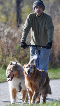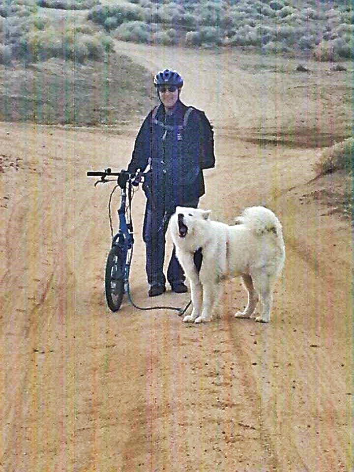 Here is Pam on Mike's scooter with Kodiak pulling. Pam's usually the