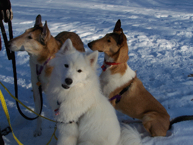 Cosmo, Suki, and Zephyr hanging together in the snow (waiting for treats)